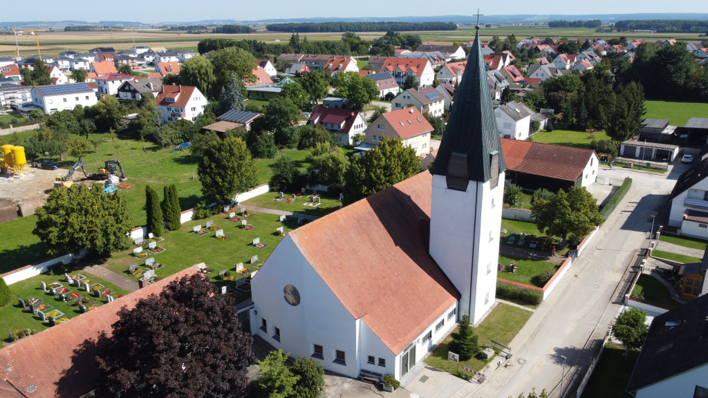 1961 fand die Einweihung dieses modernen Kirchengebäudes mit Pfarr- und Gemeindehaus statt. Ende der 60er-Jahre konnte der dazu gehörende Friedhof eröffnet werden.