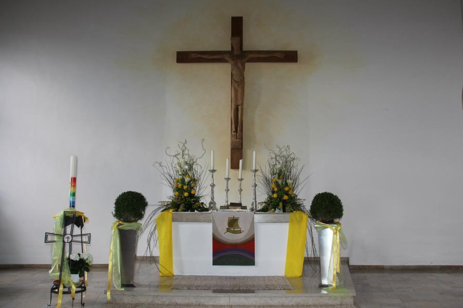 Auf dem Altar stehen vier silberne Rokokoleuchter. Die Christusfigur aus französischem Lindenholz wurde von dem Künstler Hans Ibscher 1966 geschnitzt.